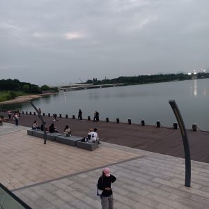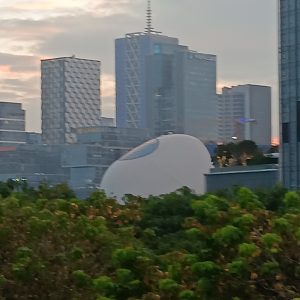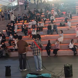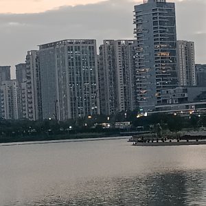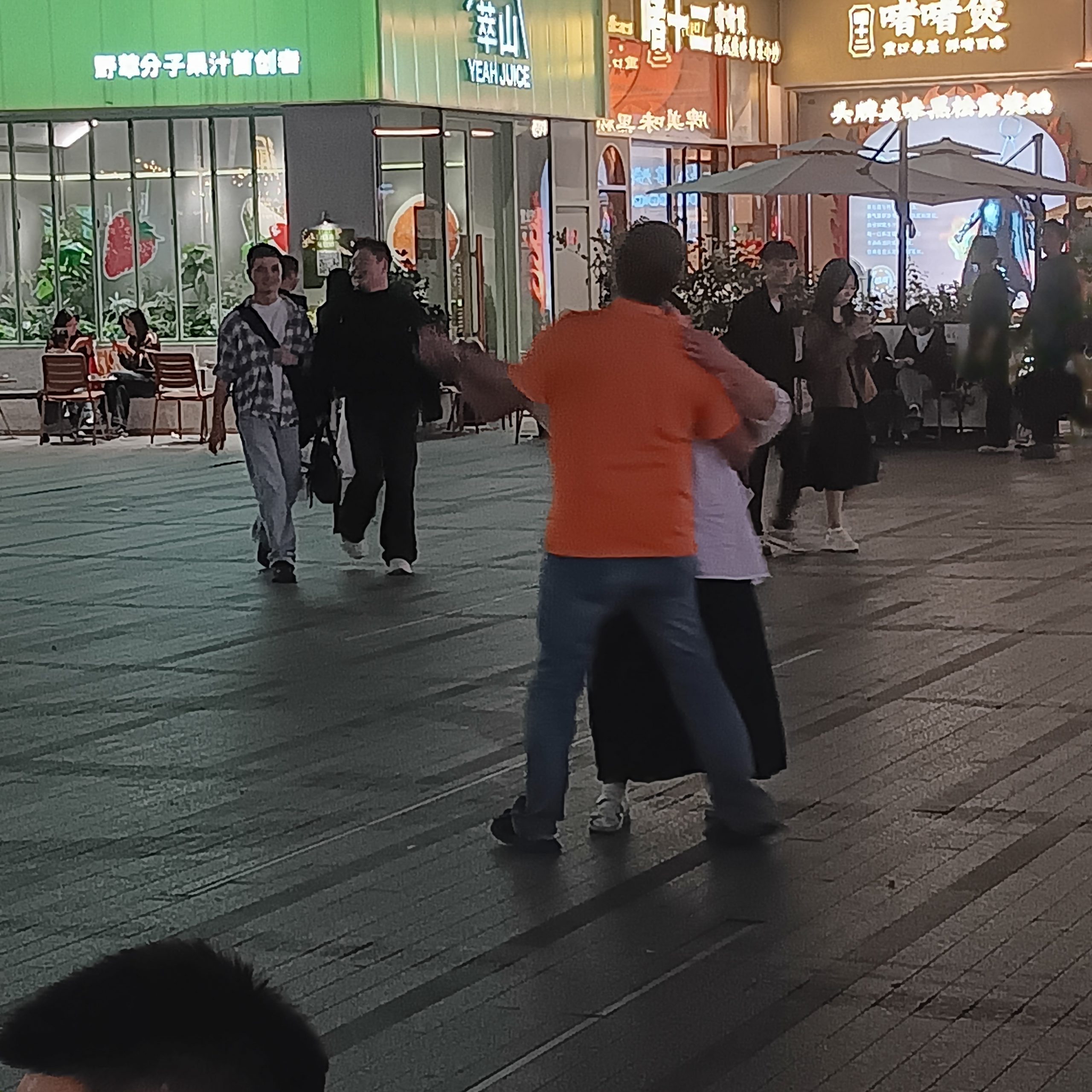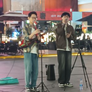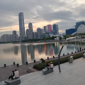 Ein Stück weiter schließlich war ein Zwischenraum zwischen Hochhäusern wie ein Amphitheater angelegt und unten davor spielte eine chinesische Karaoke-Band – zwei sehr schöne Männerstimmen im 2-stimmigen Gesang auf chinesisch. So ließen wir den lauen Sommerabend (Sonnenuntergang ca. 18 Uhr) sogar mit Tanzen ausklingen.