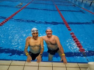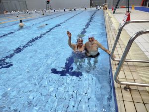 Das Hallenbad befand sich innerhalb eines großen Sportkomplexes, das Wasser hatte eine angenehme Temperatur. Das große Becken bestand aus vielen 50m-Bahnen auf denen Schwimmer ihre 300 oder 500 m sportlich absolvierten. Da Natascha und ich im Vergleich eher langsam schwammen wurden wir ins Kinderbecken (1,20m Tiefe) umgeleitet. Gute 3 Stunden verbrachten wir dort.
