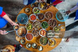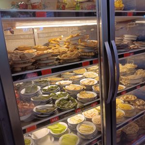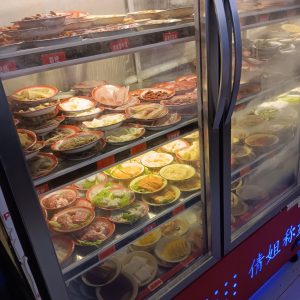 – Etwas größere Selbstbedienungsgaststätten haben Kühlschränke mit Glastüren, darin alle Arten von Speisen, meist in kleinen Schüsseln. Du nimmst ein großes Tablett , stellst alle Arten von Speiseschüsselchen darauf (Fleisch, Fisch, Reis, Nudeln, Fladen, Veganes, Gemüse, alle Arten von Beilagen). Das Tablett bringst du an den Küchenschalter. Jetzt werden deine Speisen gegart und dann an deinen Tisch gebracht. Im Raum stehen warmer Reis, heißes Wasser, die verschiedensten Gewürze zur Verfügung, man kann sich jede beliebige Menge davon nehmen.