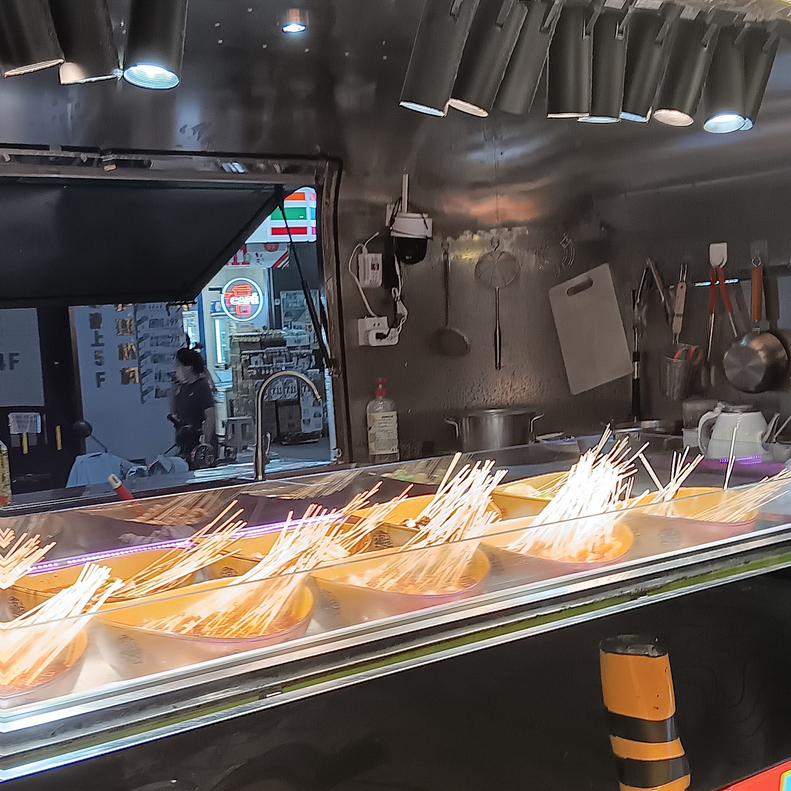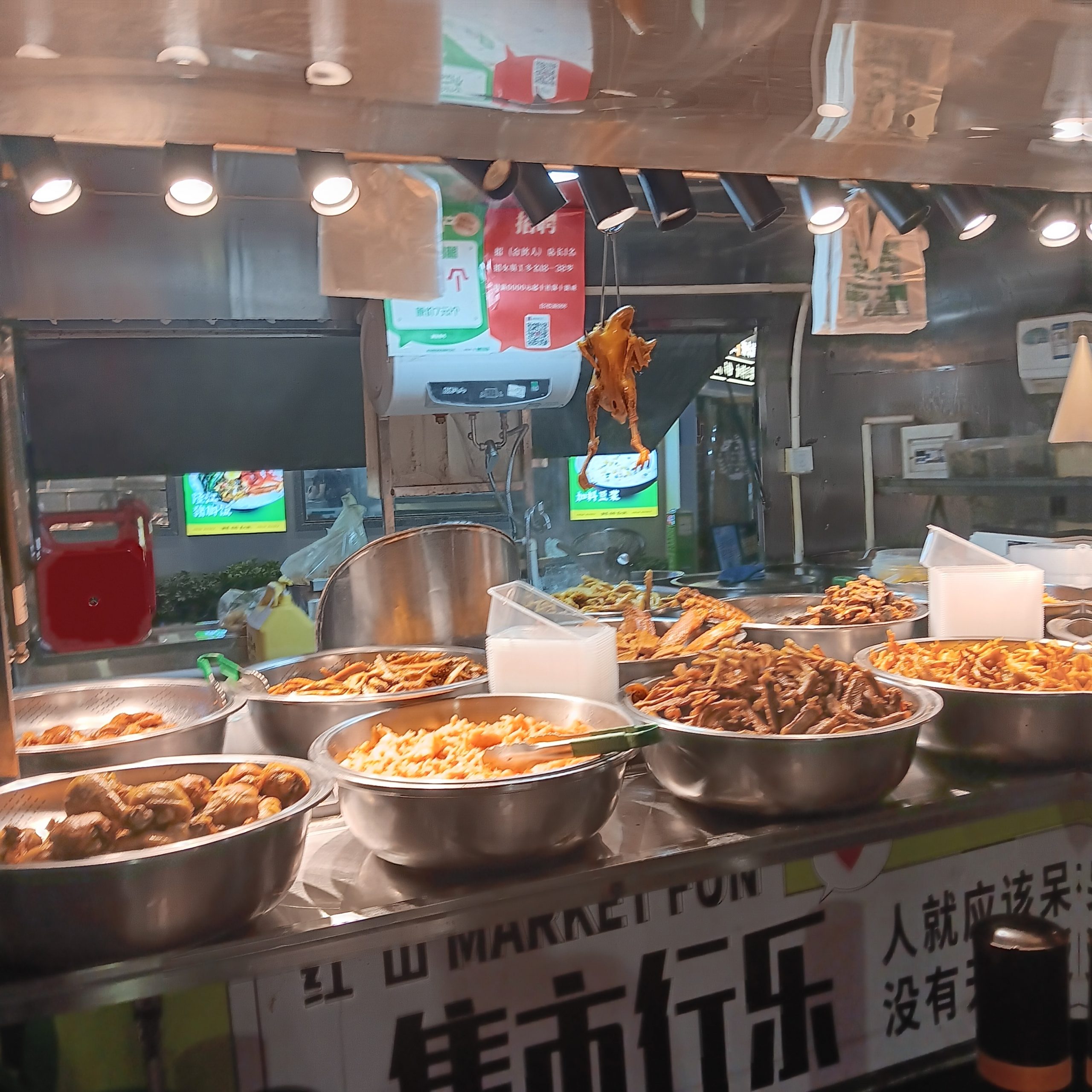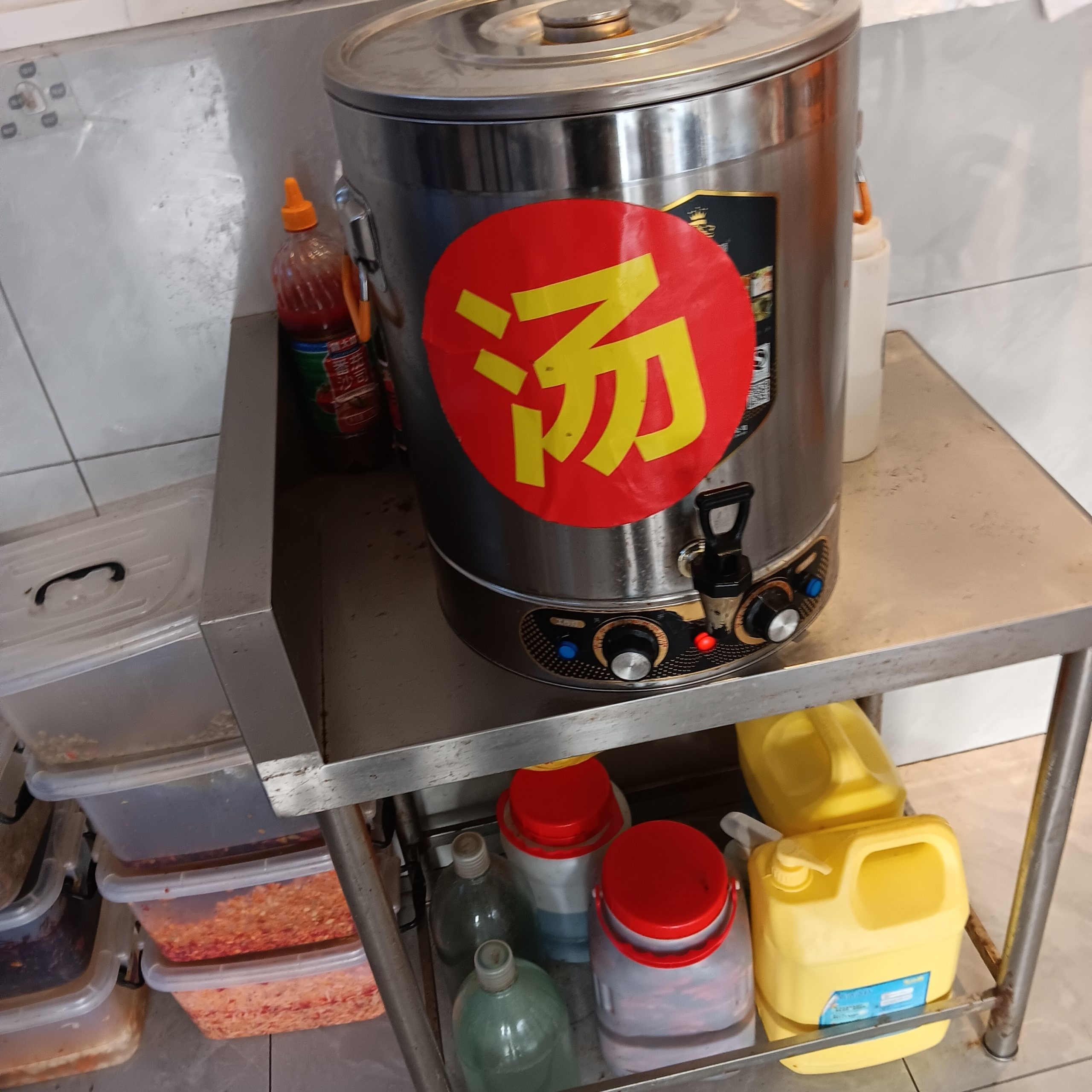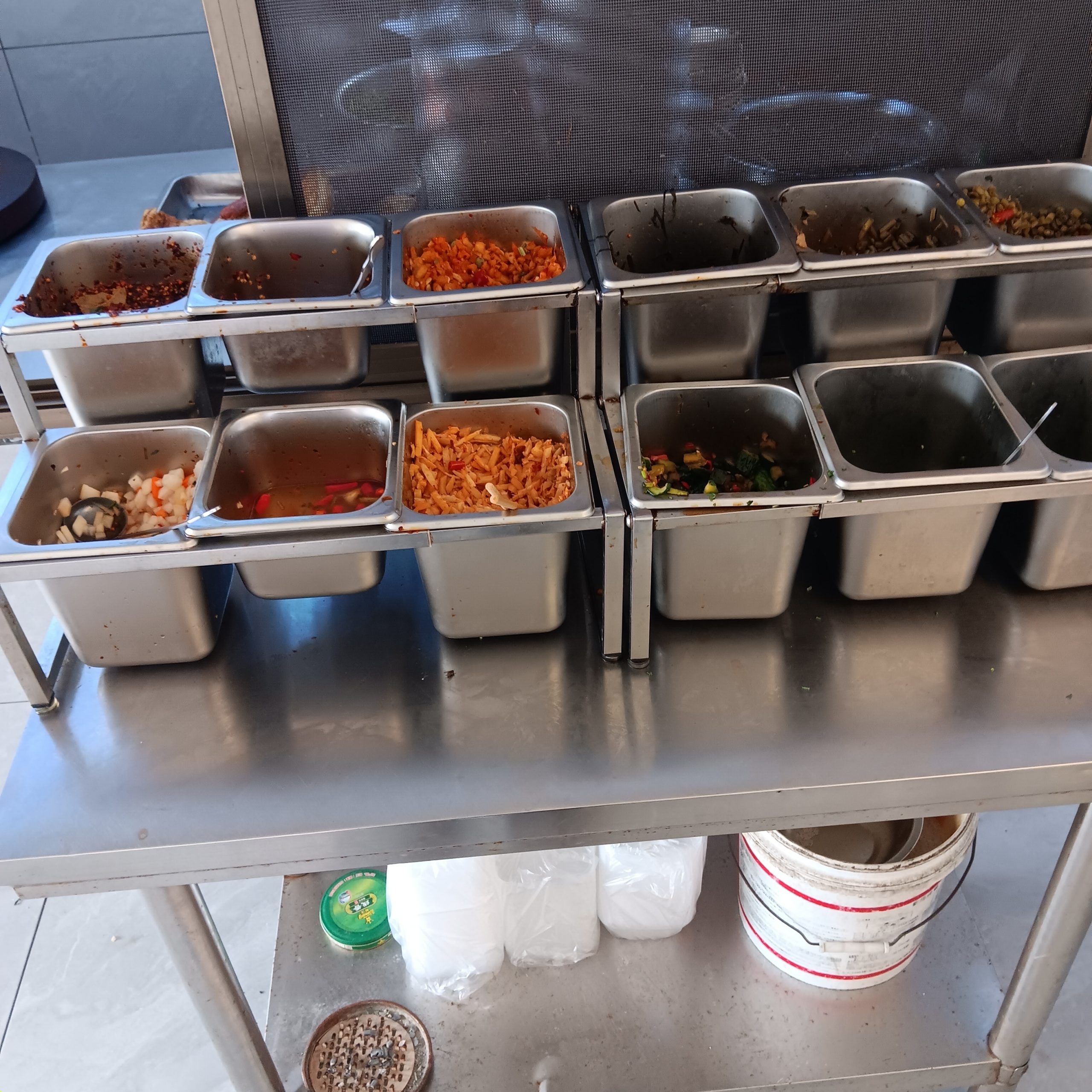 – Etwas größere Selbstbedienungsgaststätten haben Kühlschränke mit Glastüren, darin alle Arten von Speisen, meist in kleinen Schüsseln. Du nimmst ein großes Tablett , stellst alle Arten von Speiseschüsselchen darauf (Fleisch, Fisch, Reis, Nudeln, Fladen, Veganes, Gemüse, alle Arten von Beilagen). Das Tablett bringst du an den Küchenschalter. Jetzt werden deine Speisen gegart und dann an deinen Tisch gebracht. Im Raum stehen warmer Reis, heißes Wasser, die verschiedensten Gewürze zur Verfügung, man kann sich jede beliebige Menge davon nehmen.