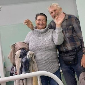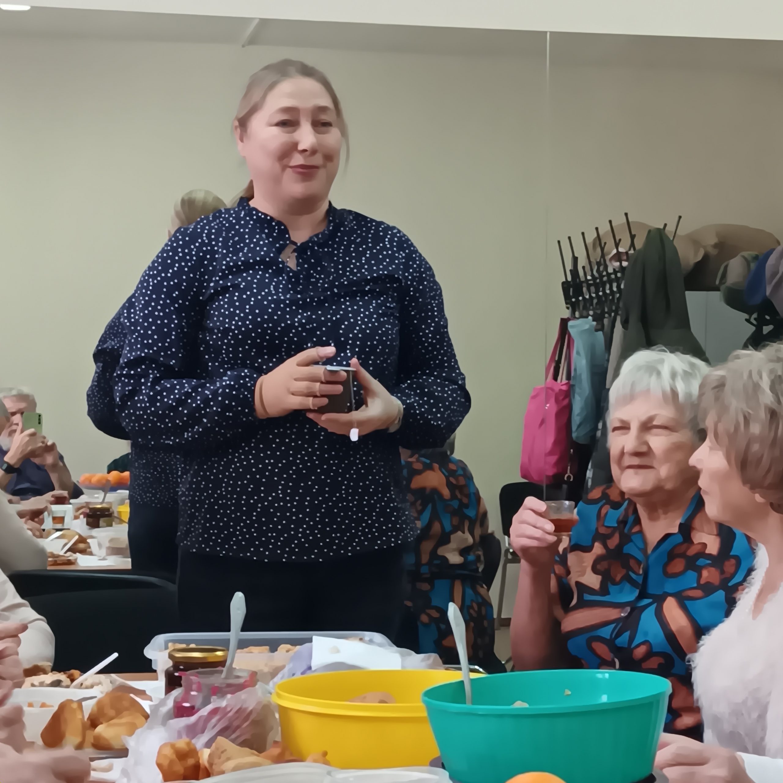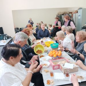 Nach dem Programm trafen wir uns in einem der Kulturhaus-Probenräume mit unserem Chor. Natascha hatte für alle etwas zum Naschen mitgebracht, wie die anderen auch. Alle waren ziemlich fröhlich und aufgekratzt. Wir erzählten von unserer Absicht einen Geburtstagsbesuch bei Alla zu machen, die ja nach der Operation Hüftknochen noch im Bett lag. Sie erzählten von ihrem Vorhaben, sie morgen auch zu besuchen.