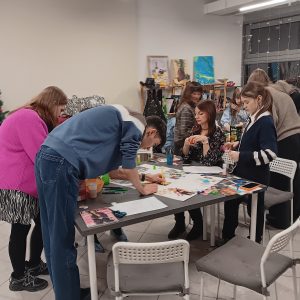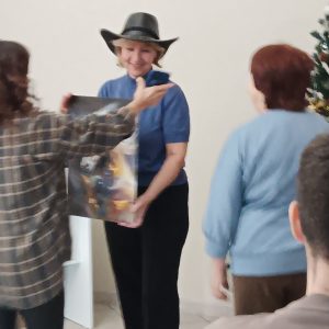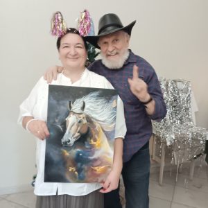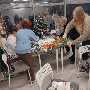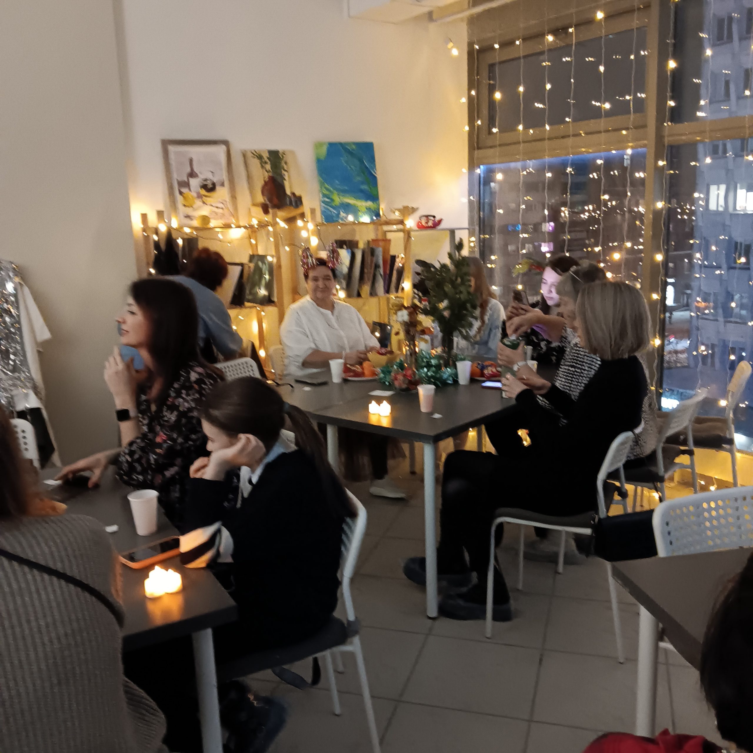 Jetzt war es draußen schon dunkel! (Sonnenaufgang:9:54, Sonnenuntergang 17:06 Uhr). Wir waren vor kurzem dem Mal- und Zeichenclub beigetreten, weil Natascha so gern und schön malt. Sie wollten heute Abend eine Jahresendfeier machen und hatten uns eingeladen. Also los zur U-Bahn, es war noch ziemlich weit. wir kamen aber rechtzeitig an. Dort hatten sie sich ein kleines Programm ausgedacht, mit allerlei Rätseln. Das war bei meinen Sprachkenntnissen allerdings schwer da richtig mit zu machen. Zum Schluss machten alle noch etwas künstlerisches und ich wurde für meinen Beitrag gelobt …