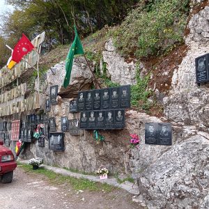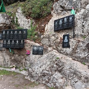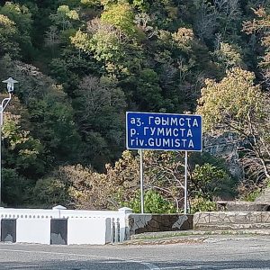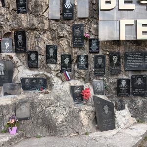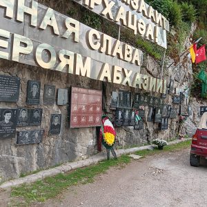Zu beiden Seiten der Brücke, an den Felswänden, sind Gedenktafeln an Gefallene der Kriege (1992, gegen Georgien. Das war sehr auffällig, auch weil es immer wieder von frischen Blumen geschmückt war. Wie ich beobachten konnte durchaus nicht von „staatlichen“ Blumen, denn es waren Privat-Pkw, die die Blumen und den Grabschmuck brachten. Wiederunm auffällig auch der Grabschmuck, der neben frischen Schnittblumen auch oft aus Gläsern, halb gefüllten Wodkaflaschen und Speisen bestand.