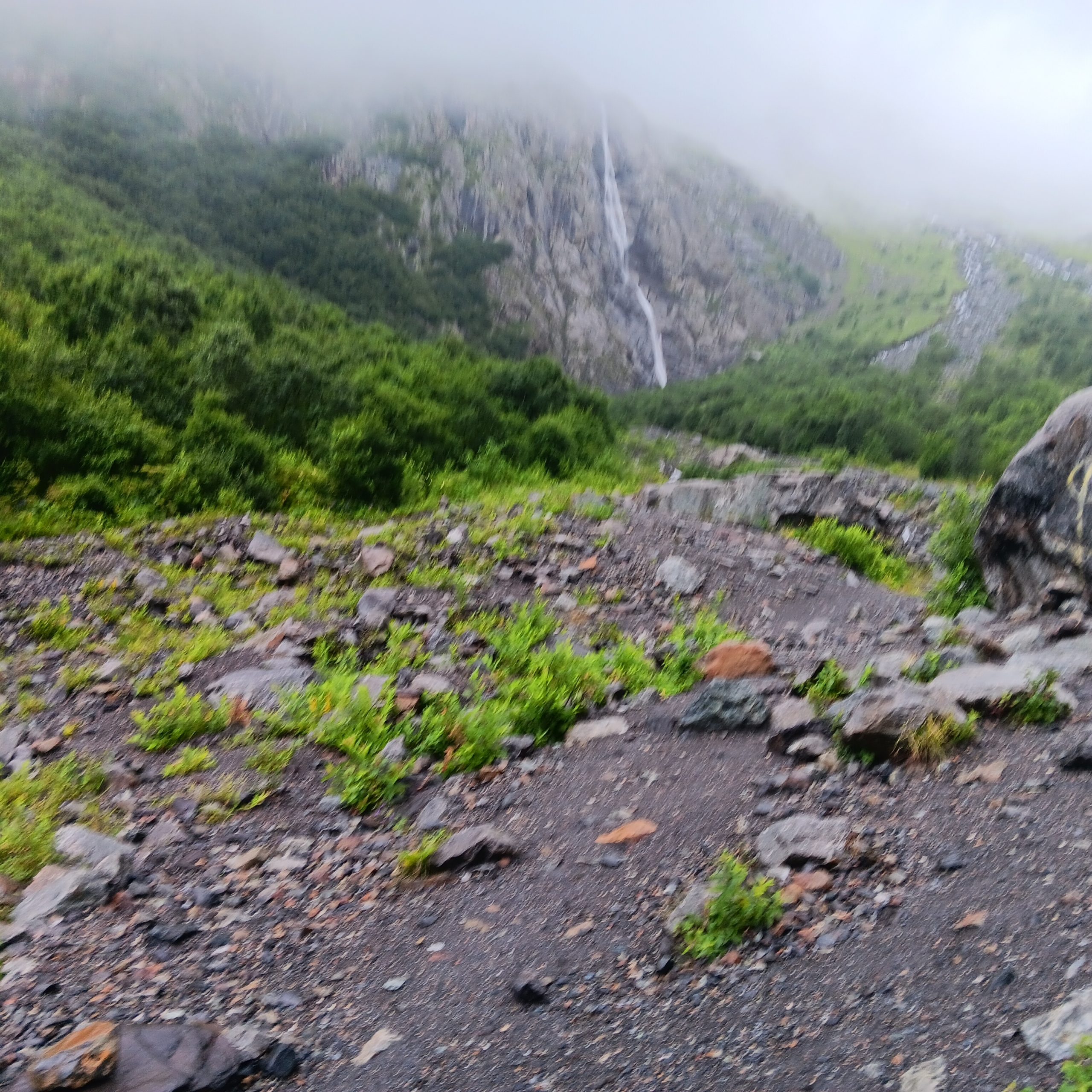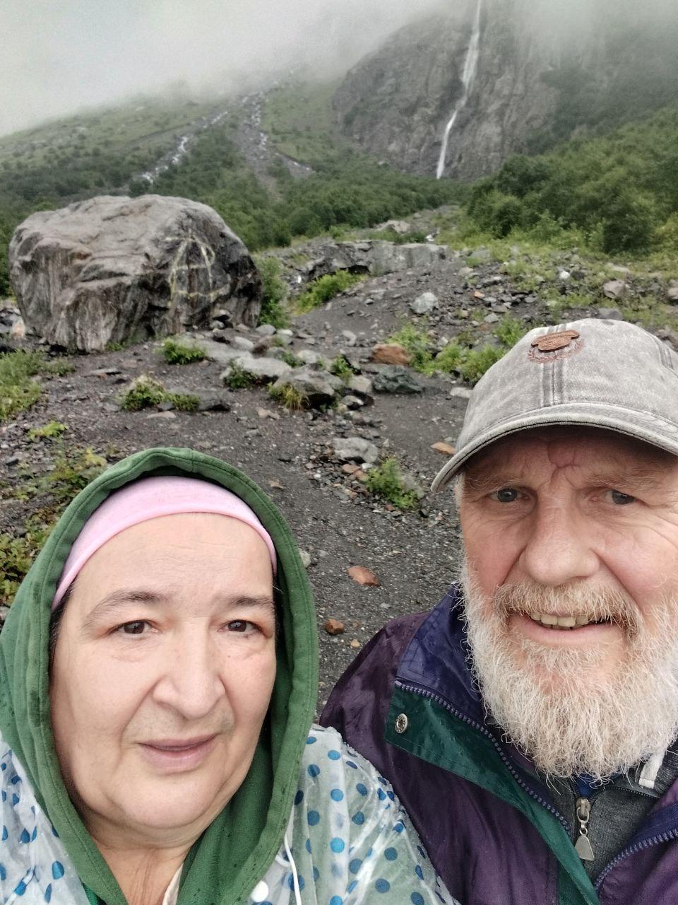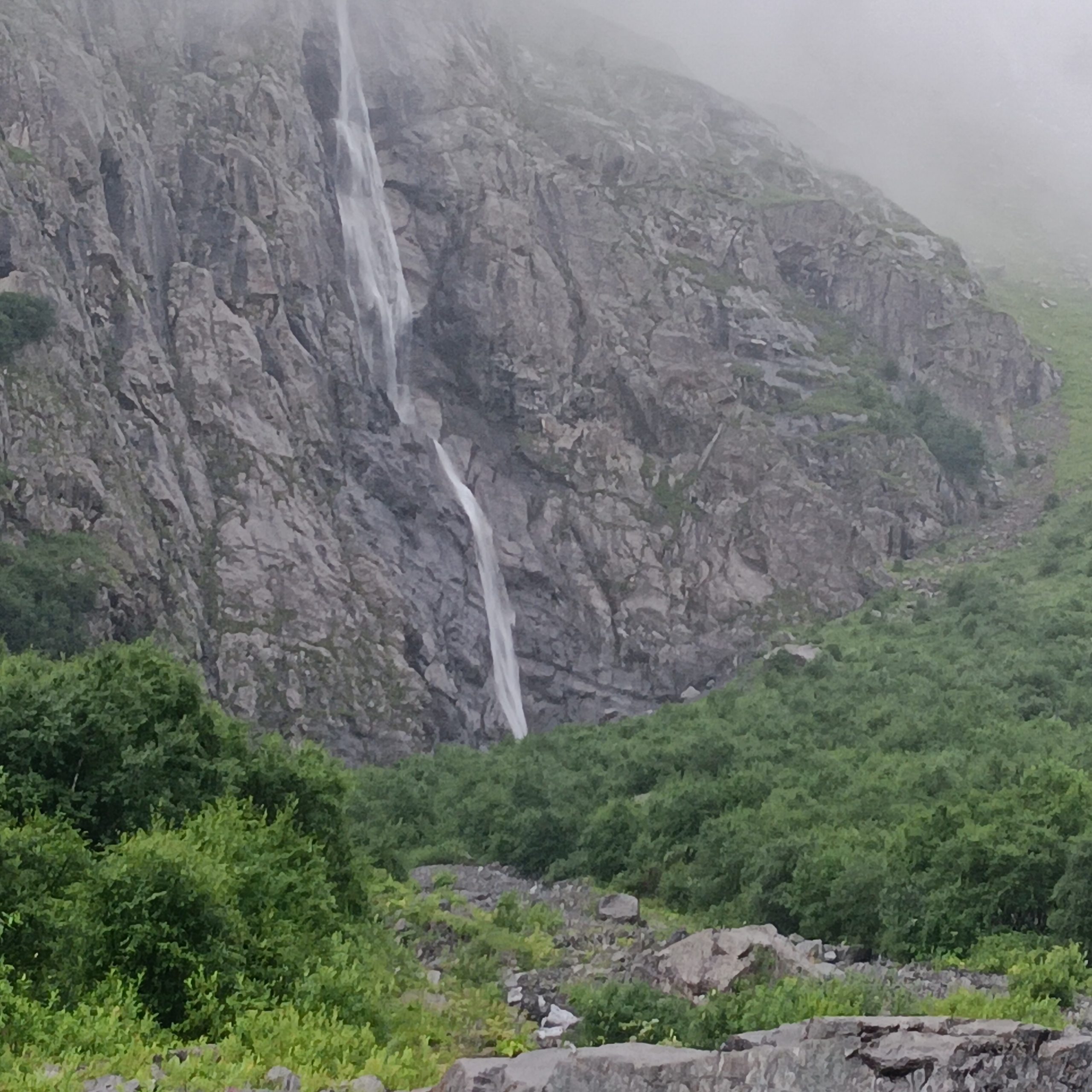 Als wir ankamen war es natürlich ein herrlicher Anblick, mitten im Kaukasus auf ca. 1500 m Höhe, auch wenn es in der Höhe ziemlich viel Nebel gab. Wir blieben noch einen Tag, ohne bis ganz nahe an den Wasserfall zu treten, es war alles ringsum total aufgeweicht und außerdem ungewohnt kalt.
