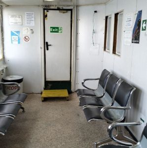 Nach gefühlten 3 Stunden durften wir auf die Führe klettern – eine Lange Treppe außen am Schiffsrumpf – dort wieder Kontrollen, ob auch alle da sind und schließlich Verpflegungsbeutel, Bettwäsche und Einweisung ins Mehrbett-Zimmer (8 Betten- Kajüte).