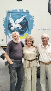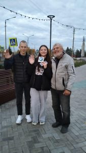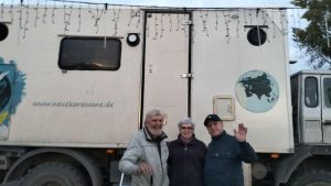 Die Dekoration unseres Autos hilft uns sehr dabei neue Bekanntschaften zu machen. Immer wieder kommen Menschen neugierig auf uns zu und fragen nach woher und wohin. Das passiert quasi täglich, daraus entwickeln sich oft längere Gespräche. Wir verteilen dabei unsere Freundschaftsaufkleber und, solange der Vorrat reicht, unsere Flyer in russischer Sprache.