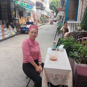 Der zur Zeit in China studierende Marcus und der deutsch sprechende Wu Sjan begleiten uns, wir sind ein lustiges Team. Die Geschaftsführerin des Kleiderladens gesellt sich dazu.