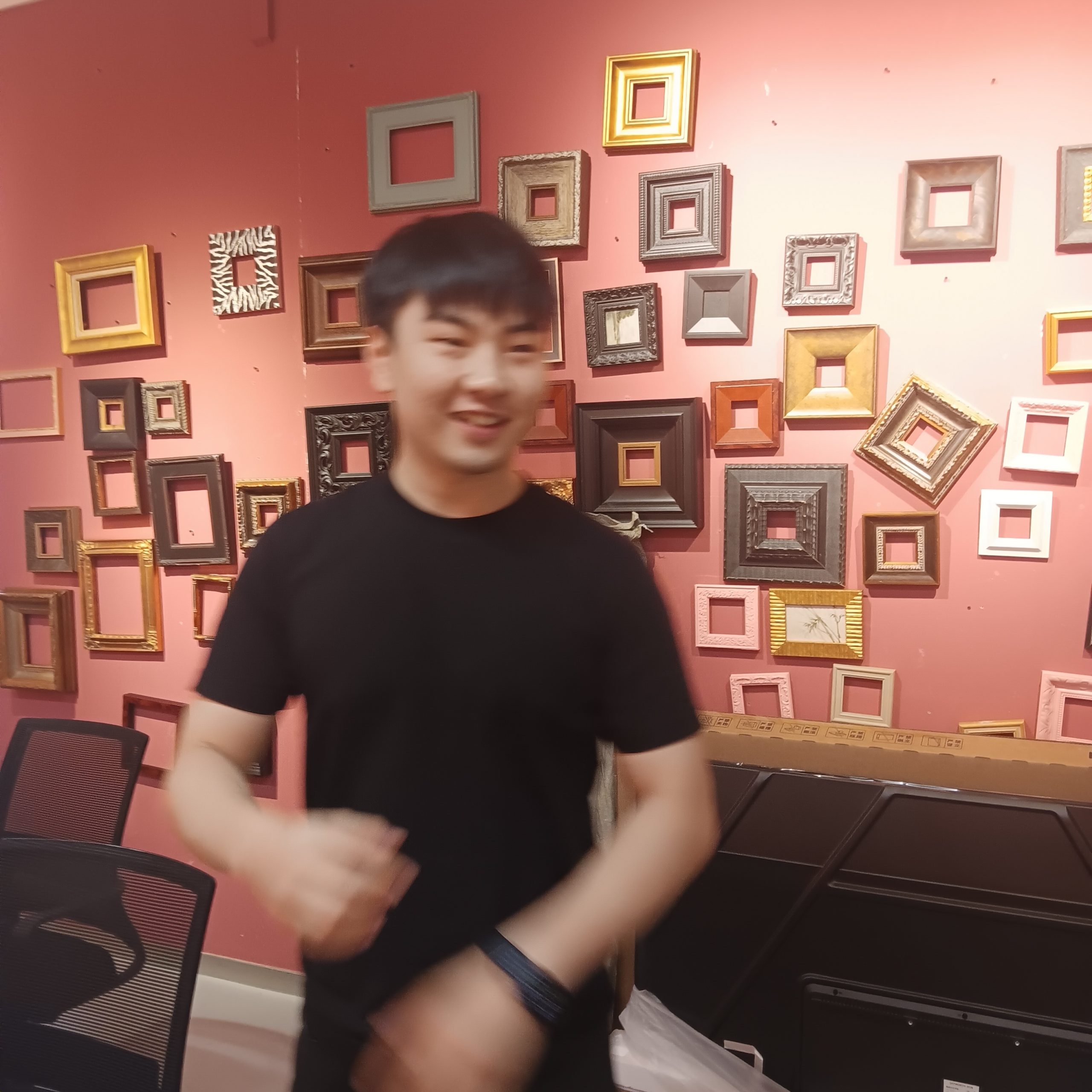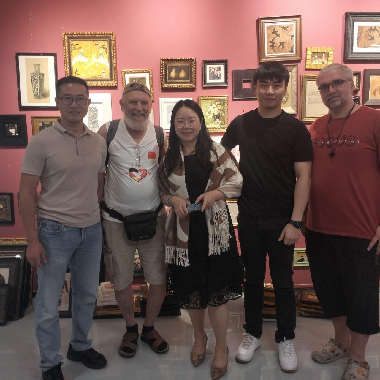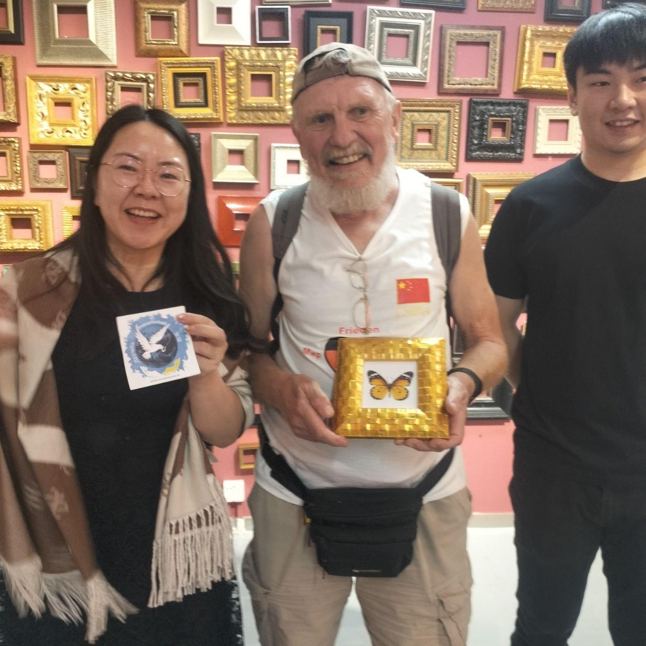 Nun, Mitten auf der Gasse steht ein protziger Porsche, wir lästern, da holt ein relativ junger Chinese etwas von diesem Rücksitz. Marcus und Wu Sjan kommen mit ihm ins Gespräch von dem ich natürlich nichts verstehe. Es stellt sich heraus, die Familie stellt Bilderrahmen aus edlen Hölzern in allen Varianten bis zum Barock her. Die werden über Amazon in alle Welt verkauft. Schließlich lädt er uns ein, wir fahren mit dem Lift und kommen in einer größeren Werkstatt mit Büro an. Seine Mutter begrüßt uns, sie ist wohl die Geschäftsführerin, denn ihr gehört wohl auch der „Electronic-Porsche“ von über 100.000 €. So gut es geht beteilige ich mich am Gespräch, die Freunde übersetzen. Als sie hört, weshalb wir in Eurasien unterwegs sind, schenkt sie uns spontan einen kleinen Bilderrahmen, passend zur Größe unseres Aufklebers, den wir ihr überreicht haben.