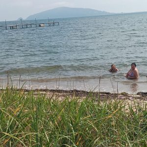 Es war tatsächlich die Idee der Urlauber, den Strand von Algenschlick etc. zu säubern, sie borgten sich bei mir Arbeitshandschuhe aus. Natascha hat sie zu uns zum Abendessen eingeladen, Salat und Pizza usw. bereitet. Es wurde viel gelacht und ich habe ein paar Beiträge mit meiner Stimme, der Gitarre dazu geliefert.