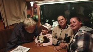 Zusammen mit Christina und ihrer Freundin hatten wir einen schönen Abend in unserem Auto. Viele Gespräche, Natascha hatte etwas zum Essen vorbereitet, ich habe schließlich die Gitarre ausgepackt und immer wieder mal ein paar Lieder eingestreut, das fand einen gr0ßen Anklang. Da die Tür von unserem Wohnhaus offen stand klopfte es bald an und die Nachbarin fragte schüchtern an, ob sie mit zuhören dürfe, natürlich durfte sie. Immer wieder Gelächter und ab und an Beifall für meine Lieder – ein herrlicher Sommerabend.